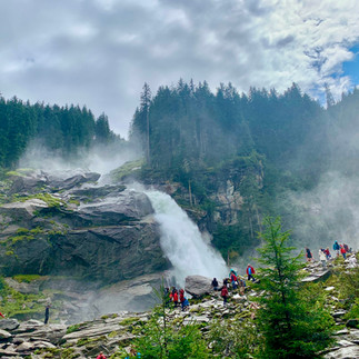 עמק שטובאי: Grawa Wasserfall: מפל רחב ועוצמתי עם "דקים" מעץ למנוחה מול הרסס.